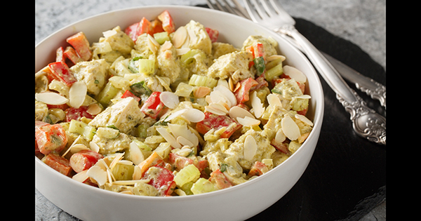 Una ensalada de pollo casera puede ser un excelente refrigerio rico en proteínas y funciona bien como aderezo para acompañar palitos de apio, pepino, lechuga, galletas de arroz o galletas saladas.